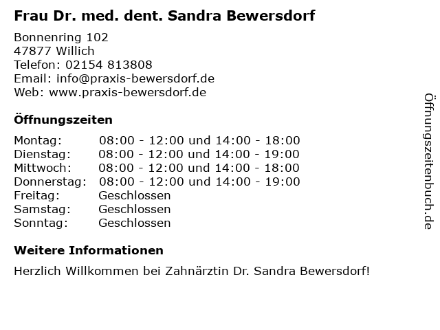 Branchen & Suchbegriffe zu Frau Dr. med. dent. Sandra Bewersdorf:bewersdorf, dent., dr., frau, med., sandra |