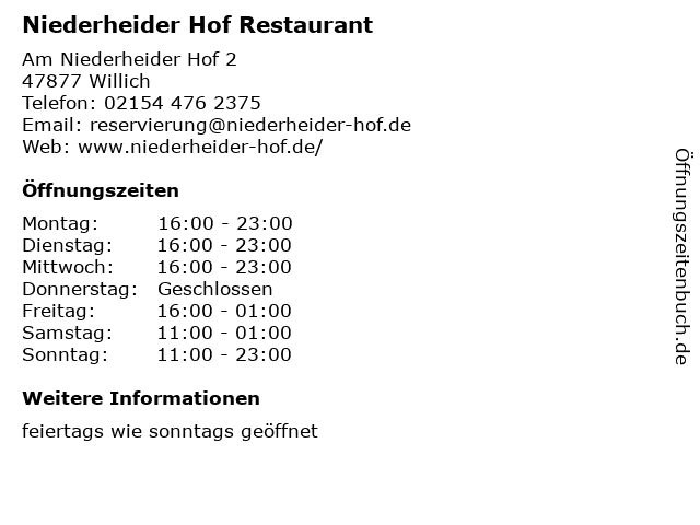 | Öffnungszeiten Niederheider Hof Restaurant in Willich anzeigen | |