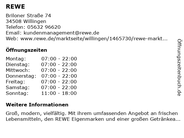 | Öffnungszeiten REWE in Willingen anzeigen | |
