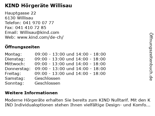 | Öffnungszeiten KIND Hörgeräte Willisau in Willisau anzeigen | |
