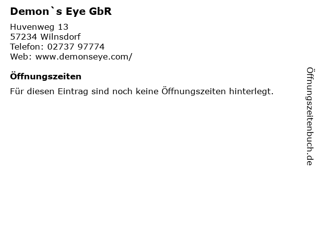 | Öffnungszeiten Demon`s Eye GbR in Wilnsdorf anzeigen | |