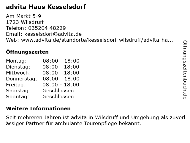 | Öffnungszeiten advita Haus Kesselsdorf in Wilsdruff anzeigen | |