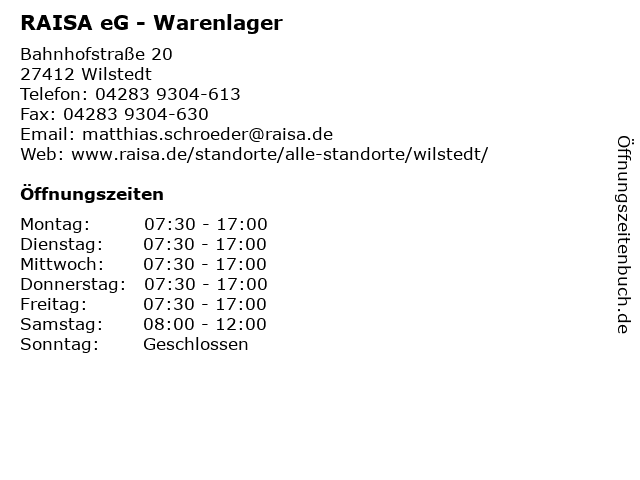 | Öffnungszeiten RAISA eG - Warenlager in Wilstedt anzeigen | |