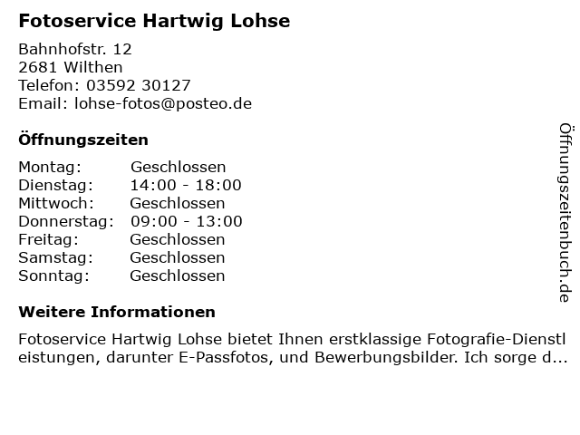 | Öffnungszeiten Fotoservice Hartwig Lohse in Wilthen anzeigen | |