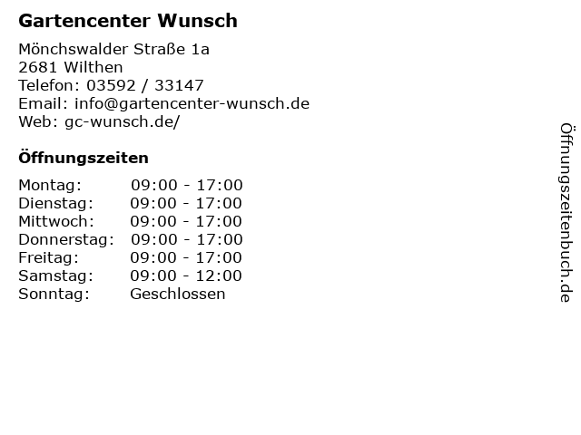 | Öffnungszeiten Gartencenter Wunsch in Wilthen anzeigen | |