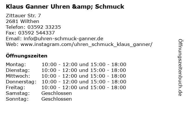 | Öffnungszeiten Klaus Ganner Uhren & Schmuck in Wilthen anzeigen | |