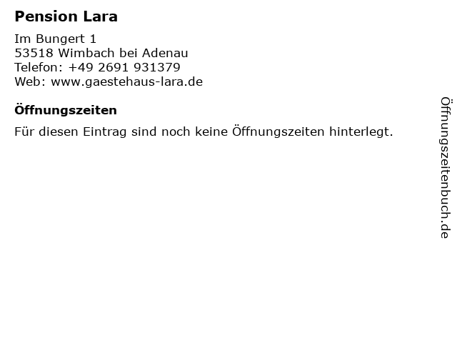 | Öffnungszeiten Pension Lara in Wimbach bei Adenau anzeigen | |
