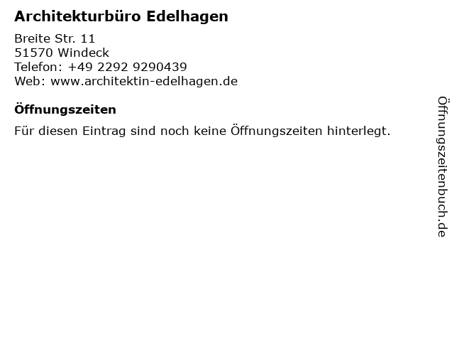 | Öffnungszeiten Architekturbüro Edelhagen in Windeck anzeigen | |