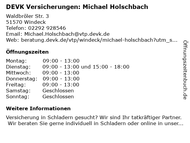 2 DEVK Versicherungen: Michael Holschbach (Berater*in ausgeschieden) (Entfernung: 1,68 km) Kirchstr. 10, 51570 Windeck 4 DEVK Versicherung Sandra Becker Gebietsleiterin (Entfernung: 8,24 km) Bahnhofstraße 26, 51545 Waldbröl 6 |