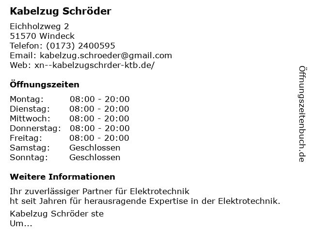 | Öffnungszeiten Kabelzug Schröder in Windeck anzeigen | |