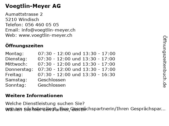 | Öffnungszeiten Voegtlin-Meyer AG in Windisch anzeigen | |