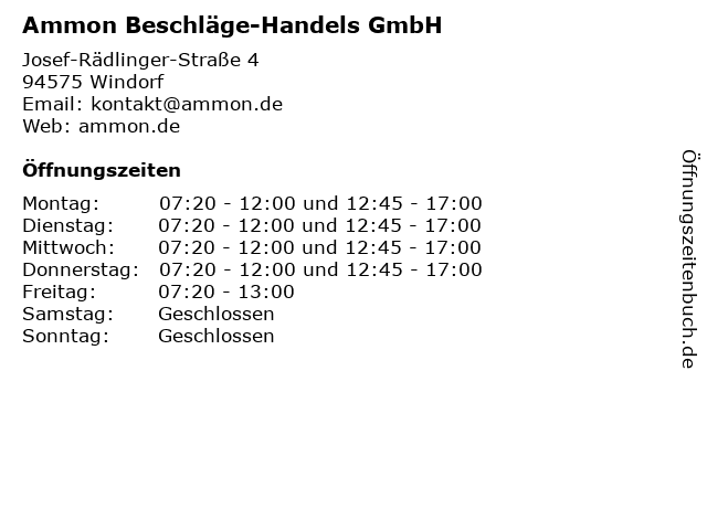 | Öffnungszeiten Ammon Beschläge-Handels GmbH in Windorf anzeigen | |
