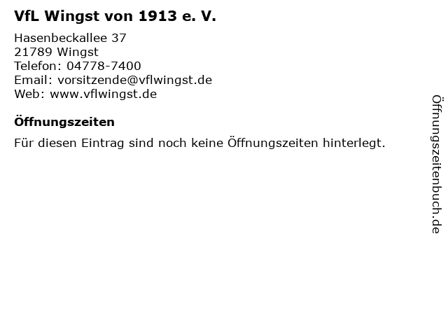 | Öffnungszeiten VfL Wingst von 1913 e. V. in Wingst anzeigen | |