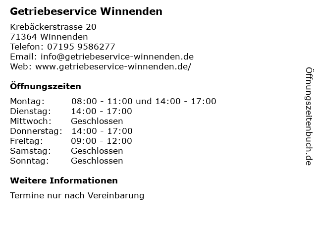 | Öffnungszeiten Getriebeservice Winnenden in Winnenden anzeigen | |