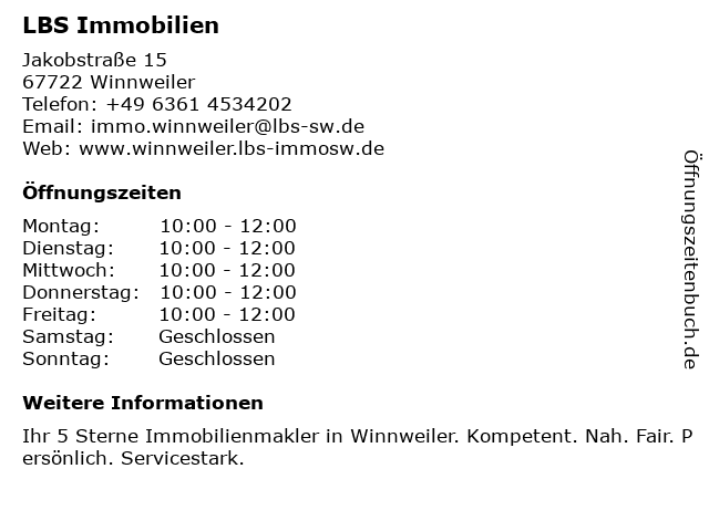 | Öffnungszeiten LBS Immobilien in Winnweiler anzeigen | |