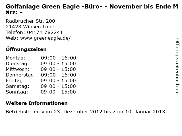 Branchen & Suchbegriffe zu Golfanlage Green Eagle -Büro- - November bis Ende März: -:beratung, betriebsferien, bis, büro, dezember, dienstleistung, eagle, ende, golf, golfanlage, golfanlage green eagle, green, information, januar, märz, märz:, november, restaurant, service, vom |