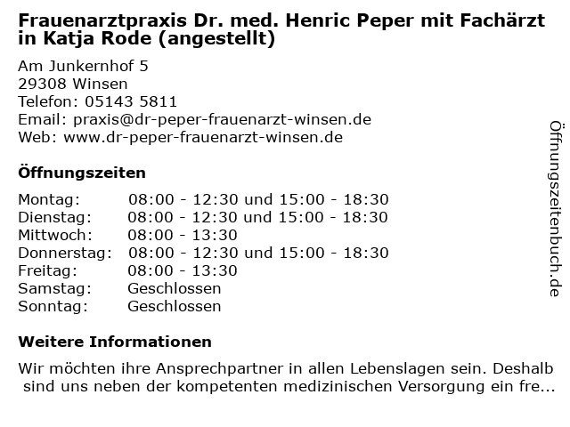 1 Dr. Henric Peper/ Praxis für Frauenheilkunde und Geburtshilfe im Gesundheitszentrum Am Marktplatz (Entfernung: 0,01 km) Am Junkernhof 5, 29308 Winsen 6 |