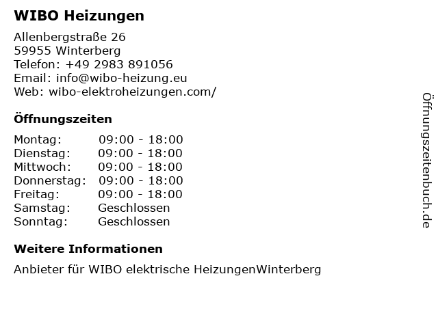 | Öffnungszeiten WIBO Heizungen in Winterberg anzeigen | |