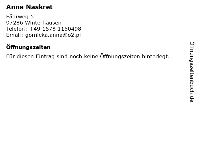 | Öffnungszeiten Anna Naskret in Winterhausen anzeigen | |