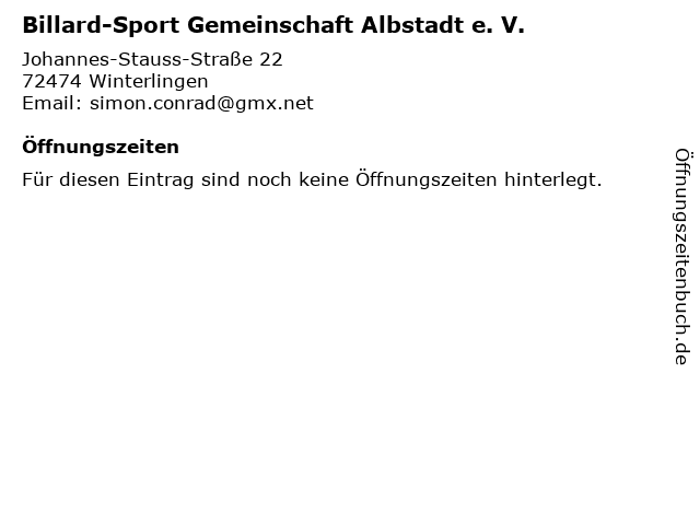 | Öffnungszeiten Billard-Sport Gemeinschaft Albstadt e. V. in Winterlingen anzeigen | |