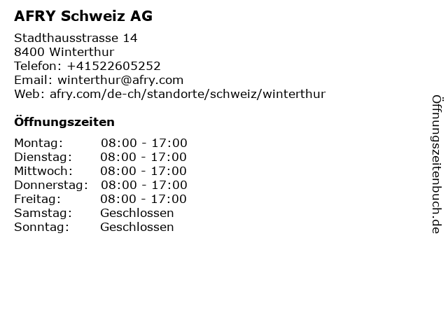 | Öffnungszeiten AFRY Schweiz AG in Winterthur anzeigen | |