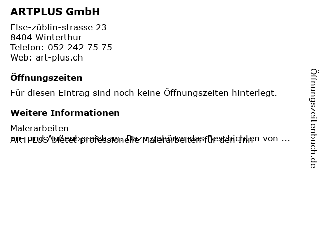 | Öffnungszeiten ARTPLUS GmbH in Winterthur anzeigen | |