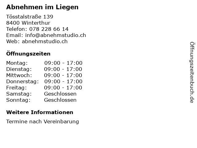 | Öffnungszeiten Abnehmen im Liegen in Winterthur anzeigen | |