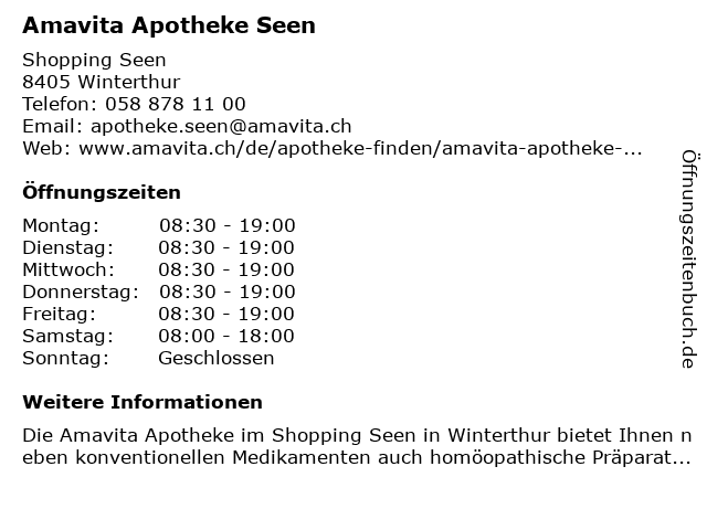 | Öffnungszeiten Amavita Apotheke Seen in Winterthur anzeigen | |