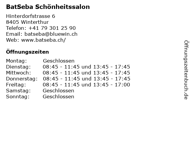 | Öffnungszeiten BatSeba Schönheitssalon in Winterthur anzeigen | |