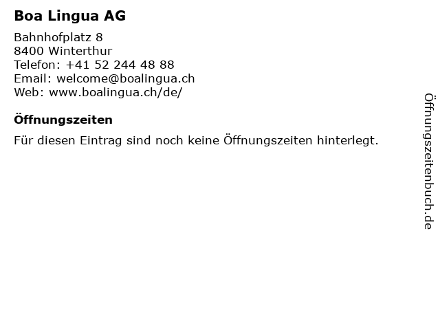 | Öffnungszeiten Boa Lingua AG in Winterthur anzeigen | |