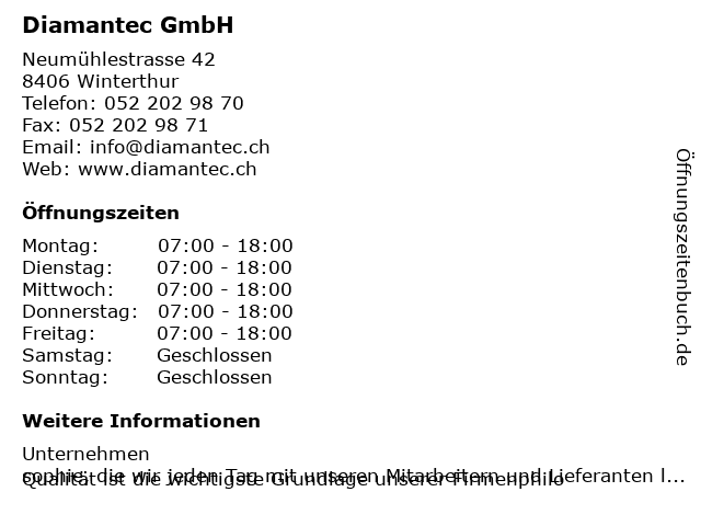 | Öffnungszeiten Diamantec GmbH in Winterthur anzeigen | |