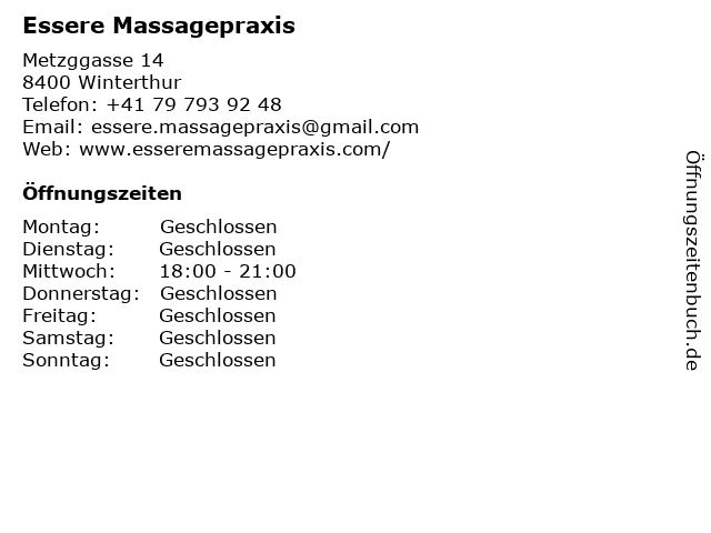 | Öffnungszeiten Essere Massagepraxis in Winterthur anzeigen | |