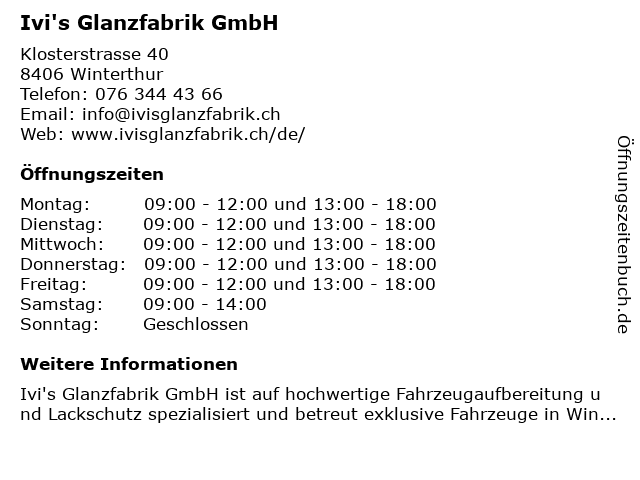 | Öffnungszeiten Ivi's Glanzfabrik GmbH in Winterthur anzeigen | |
