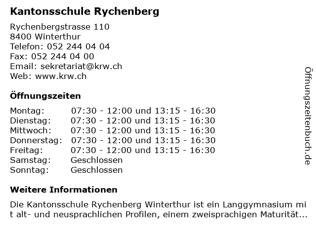 | Öffnungszeiten Kantonsschule Rychenberg in Winterthur anzeigen | |
