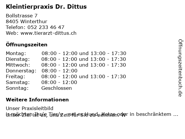 1 Kleintierpraxis Julius Cæsar Dr.med.vet. Jacqueline Haener (Entfernung: 2,37 km) Römerstrasse 47, 8400 Winterthur 3 Kleintierpraxis ACR Dr. med. vet. Gabriela Ehrismann (Entfernung: 4,19 km) Zürcherstrasse 120, 8406 Winterthur 6 Kleintierpraxis am Bahnhof Dr.Catherine Brenner (Entfernung: 8,54 km) Bahnhofstrasse 13a, 8307 Effretikon |