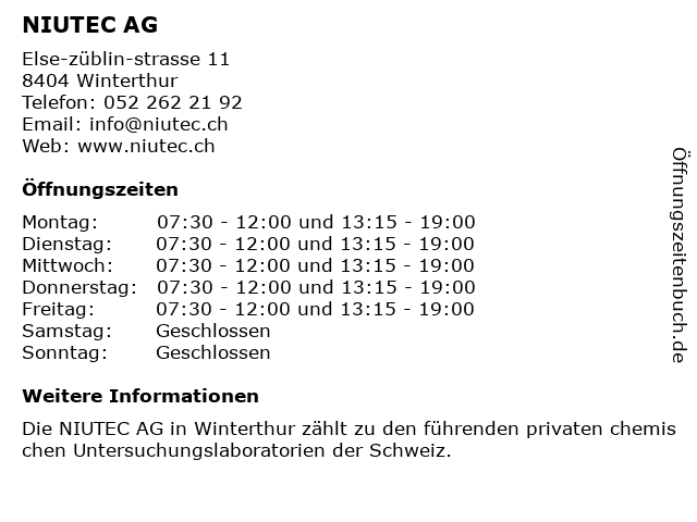 | Öffnungszeiten NIUTEC AG in Winterthur anzeigen | |