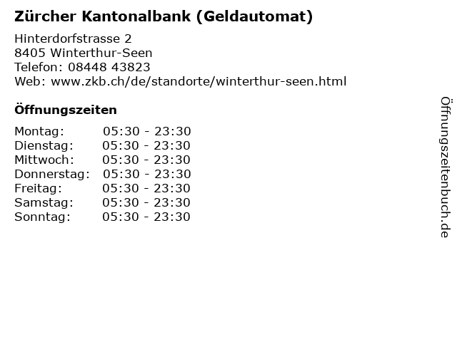 2 Zürcher Kantonalbank (Geldautomat) (Entfernung: 2,31 km) Archstrasse/Archplatz keine, 8400 Winterthur 6 |