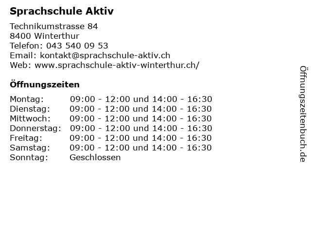 | Öffnungszeiten Sprachschule Aktiv in Winterthur anzeigen | |