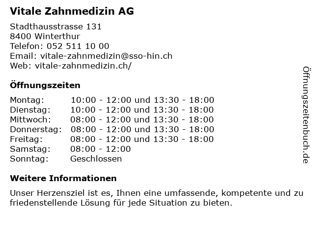 | Öffnungszeiten Vitale Zahnmedizin AG in Winterthur anzeigen | |