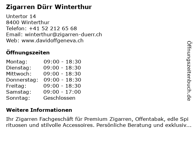 | Öffnungszeiten Zigarren Dürr Winterthur in Winterthur anzeigen | |