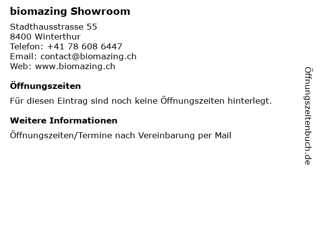 | Öffnungszeiten biomazing Showroom in Winterthur anzeigen | |
