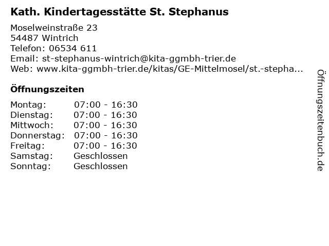2 St. Stephanus Hotelges. Hotel Moselpark (Entfernung: 8,42 km) Kueser Plateau 2, 54470 Bernkastel-Kues 4 Kath. Kindertageseinrichtung St. Stephanus (Ganztags) (Entfernung: 8,91 km) Raiffeisenstraße 3, 54472 Monzelfeld 5 Weinhotel St. Stephanus Inh. Hermann Saxler (Entfernung: 9,17 km) Uferallee 9, 54492 Zeltingen-Rachtig 6 |