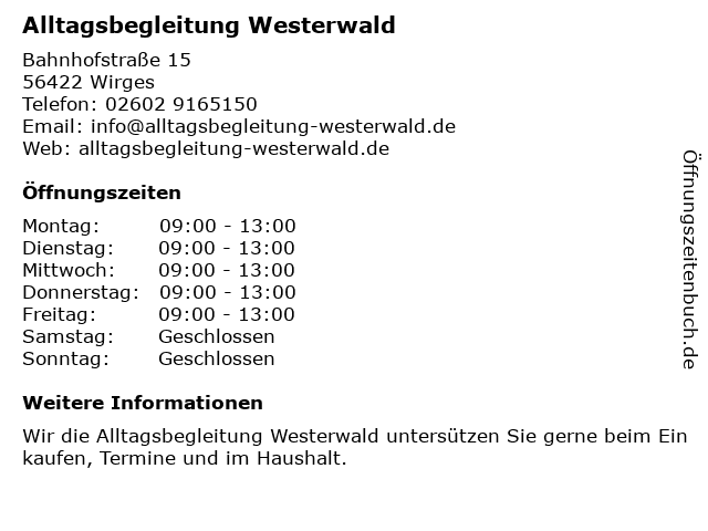 | Öffnungszeiten Alltagsbegleitung Westerwald in Wirges anzeigen | |