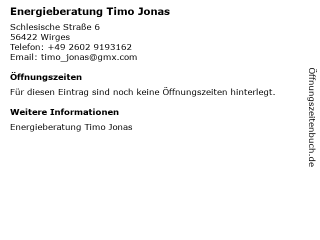 | Öffnungszeiten Energieberatung Timo Jonas in Wirges anzeigen | |