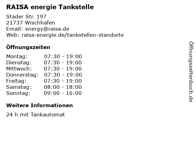 | Öffnungszeiten RAISA energie Tankstelle in Wischhafen anzeigen | |