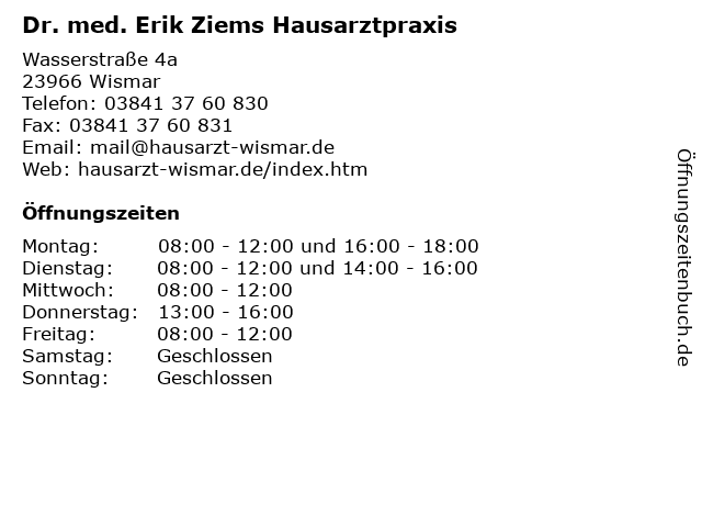 3 Dr. med. Erik Ziems-Facharzt für Allgemeinmedizin, Manuelle Medizin / Chirotherapie, Notfallmedizin (Entfernung: 1,32 km) An der Koggenoor 23-25, 23966 Wismar 4 Erik Eckl Familienarztpraxis - Allgemeinmedizin (Entfernung: 1,39 km) Schweriner Straße 24, 23970 Wismar 5 Hausarztpraxis Dipl. med. Annelie Fentens (Entfernung: 1,61 km) Bürgermeister-Haupt-Straße 31 A, 23966 Wismar 6 Hausarztpraxis Dipl.-Med. Anita Windhoefer (Entfernung: 1,72 km) Hans-Grundig-Straße 34, 23966 Wismar |