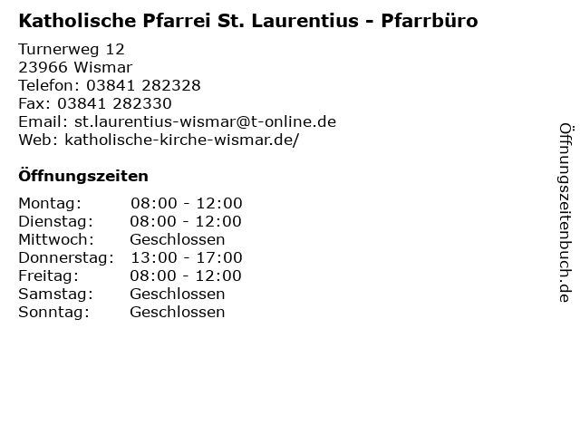 3 Laurentius Kirche Hornstorf - Ev.-Luth. Kirchengemeinde Neuburg (Entfernung: 4,72 km) Hauptstraße 9, 23974 Hornstorf 4 St.-Laurentius-Kirche Schönberg - Ev.-Luth. Kirchengemeinde Schönberg (Entfernung: 35,50 km) An der kirche 14, 23923 Schönberg 5 St.-Laurentius-Kirche Ziethen - Ev.-Luth. Kirchengemeinde Ziethen (Entfernung: 48,39 km) Kirchstraße 1, 23911 Ziethen 6 |