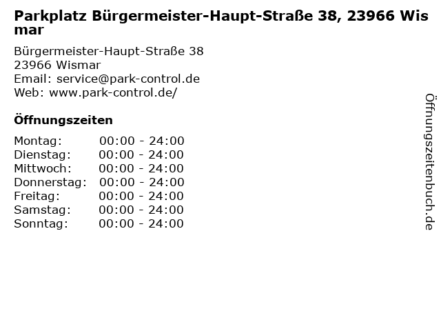 | Öffnungszeiten Parkplatz Bürgermeister-Haupt-Straße 38, 23966 Wismar in Wismar anzeigen | |
