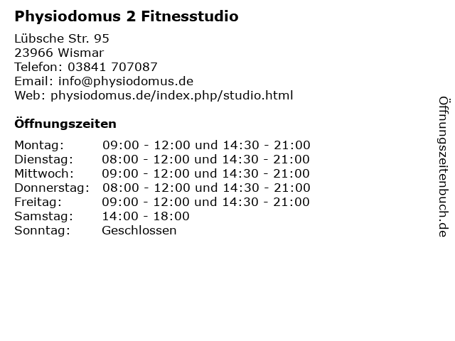 | Öffnungszeiten Physiodomus 2 Fitnesstudio in Wismar anzeigen | |