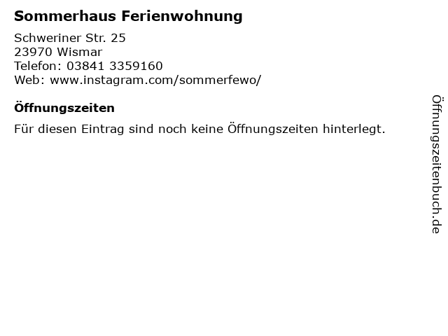 | Öffnungszeiten Sommerhaus Ferienwohnung in Wismar anzeigen | |